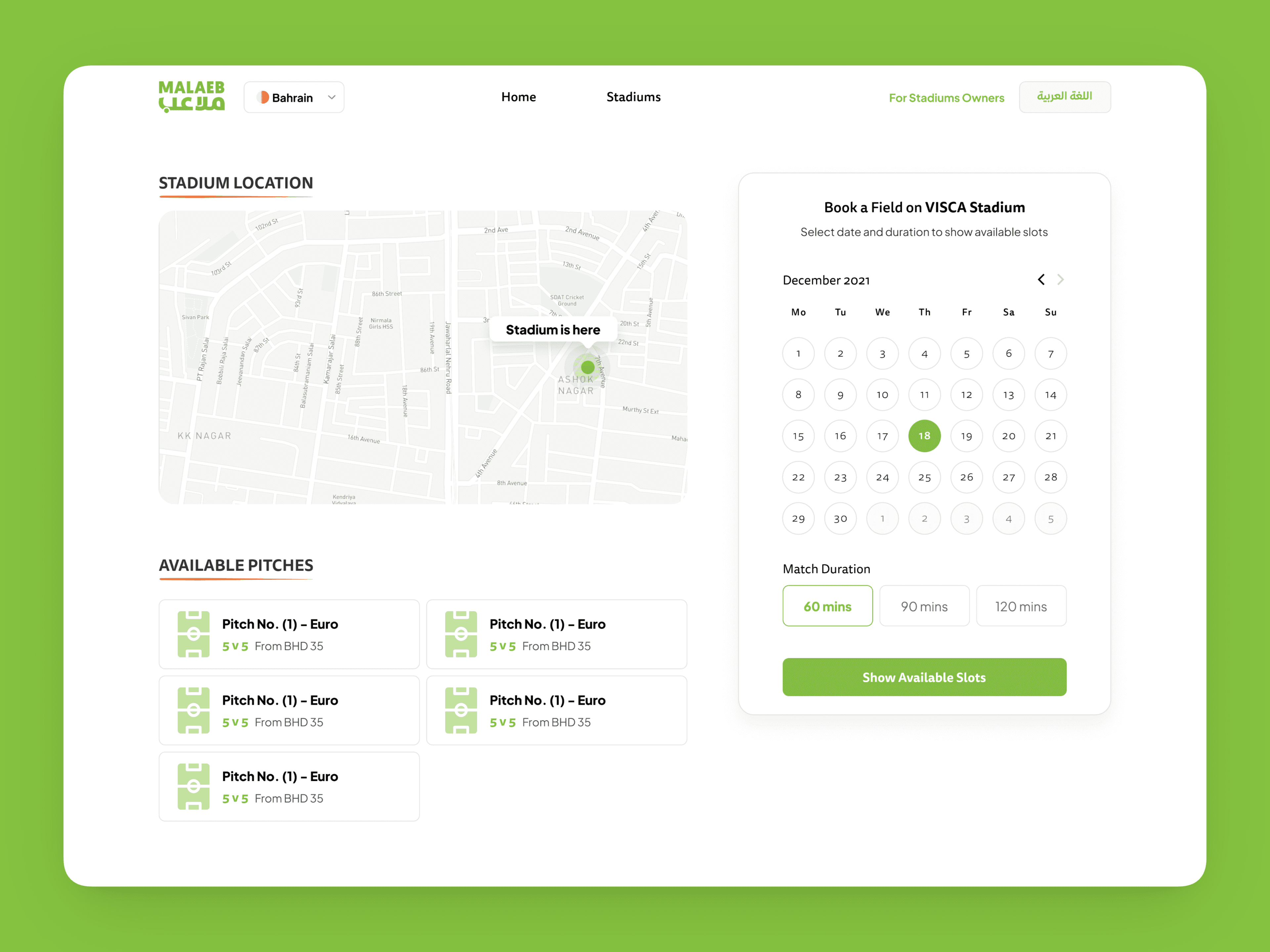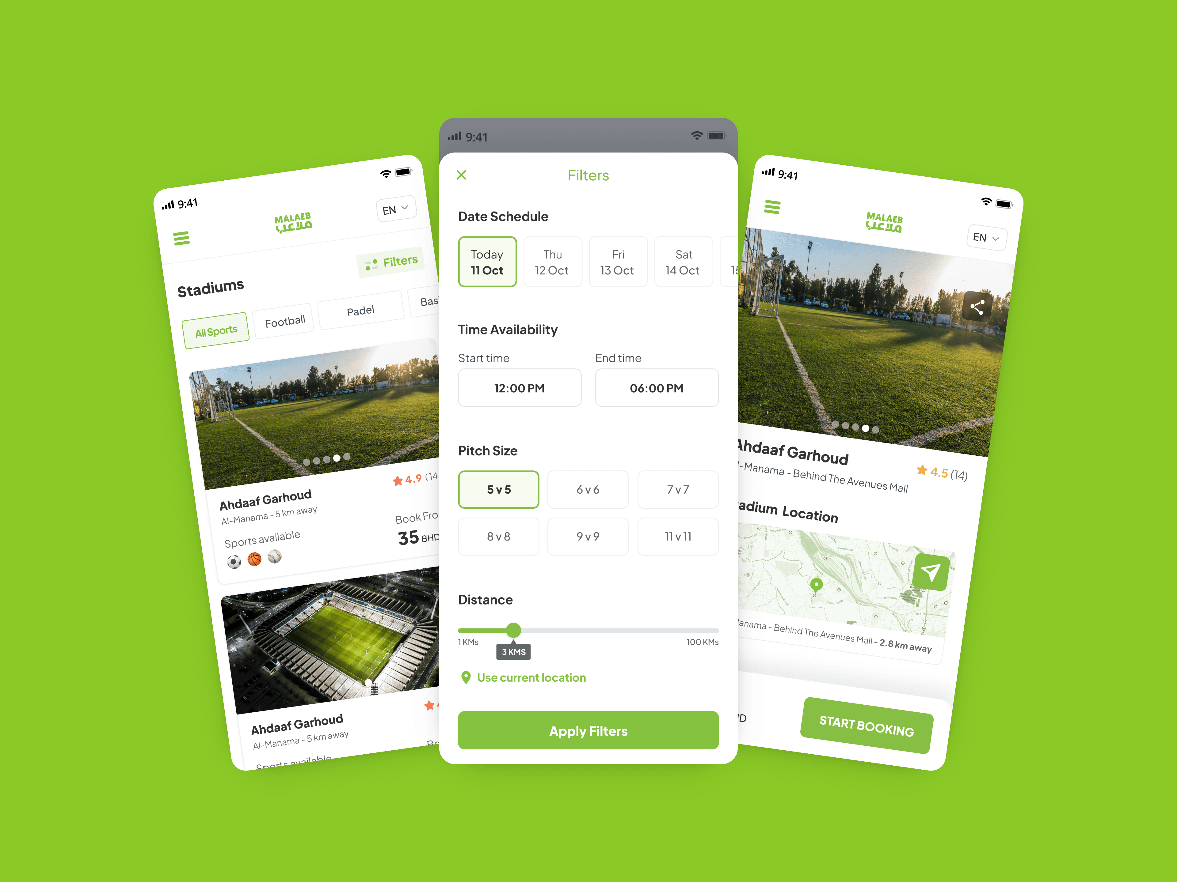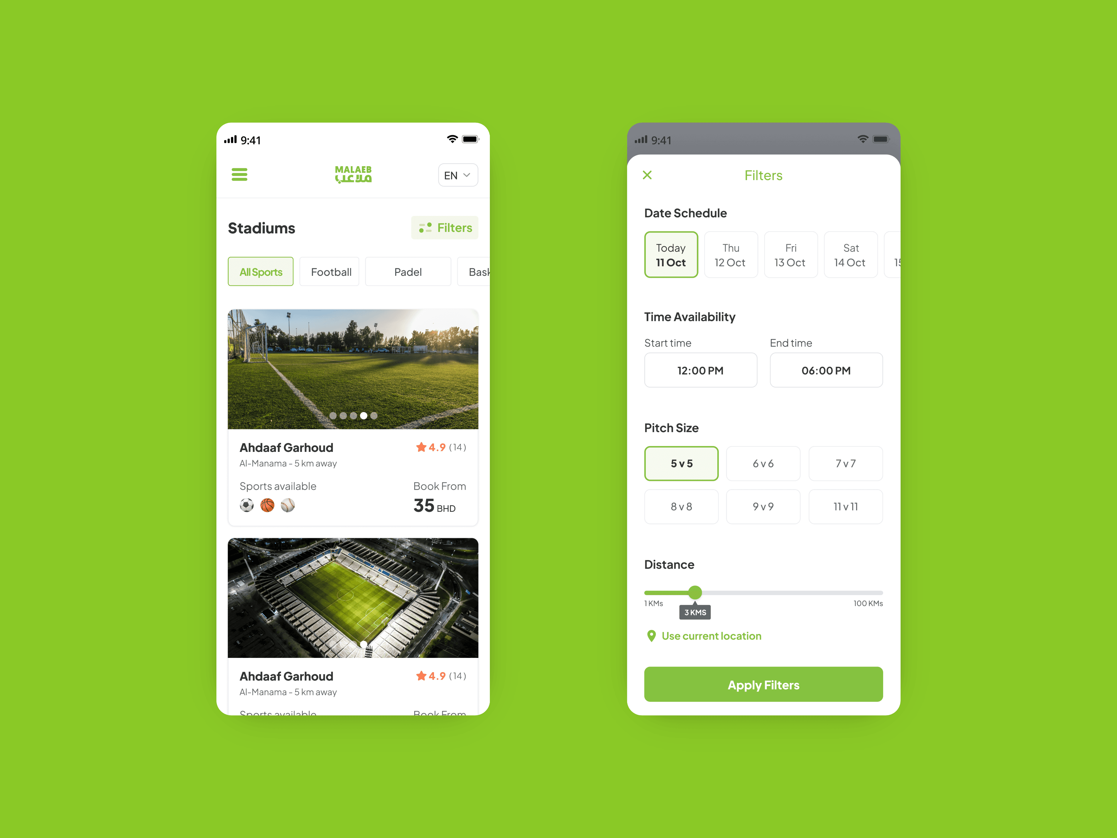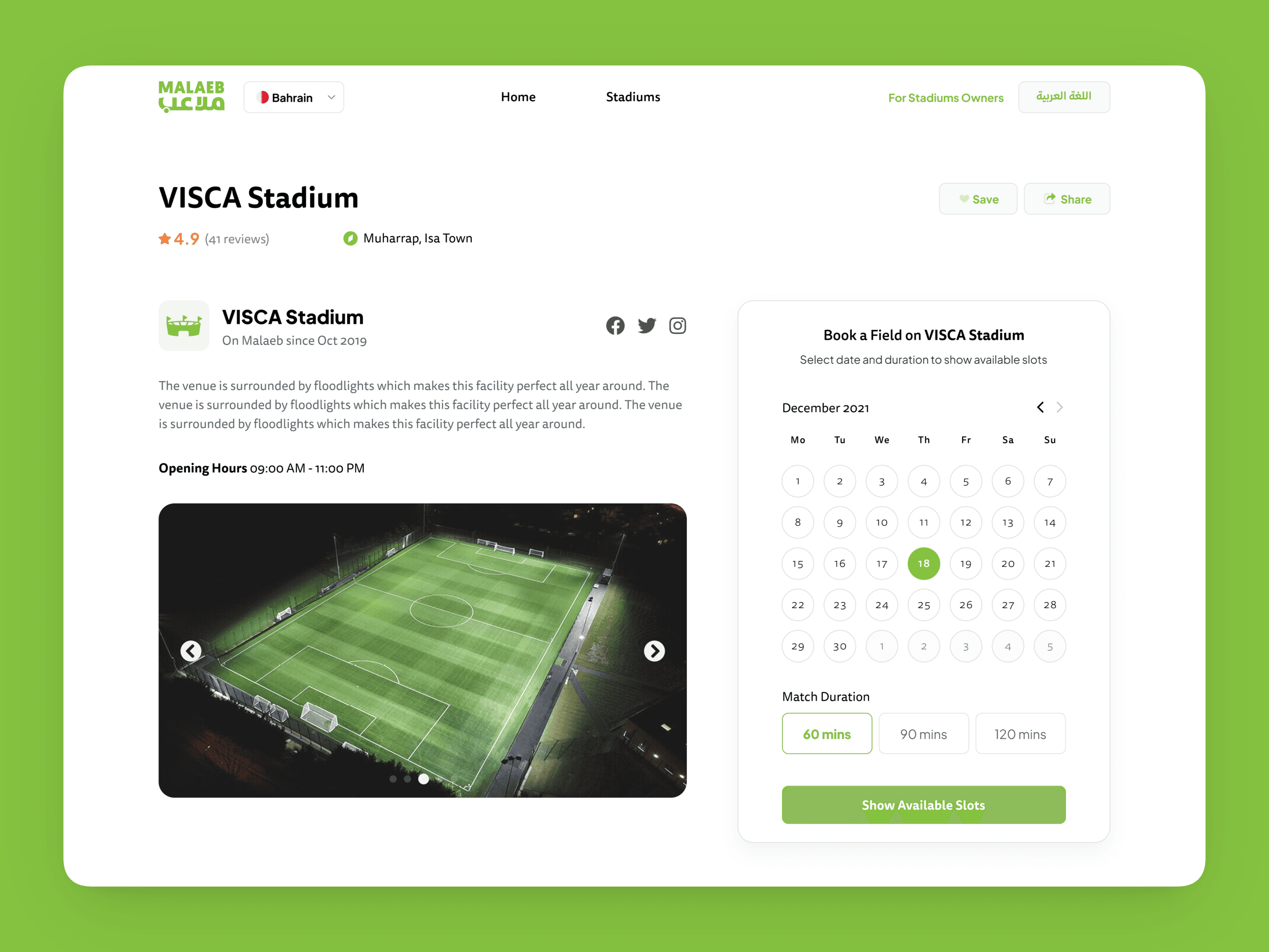 Simplifying how people discover, book, and play sports—while empowering venue owners to grow Malaeb is a sports booking and community platform operating across Bahrain and the GCC, enabling players to book stadiums, join matches, organize teams, and participate in leagues—while providing stadium owners with tools to manage bookings and operations. The platform supports football, padel, basketball, tennis, volleyball, and more, serving both players and venue owners through mobile apps and a full web experience.