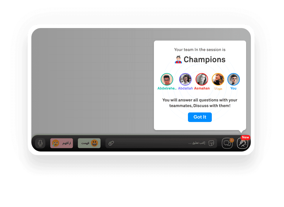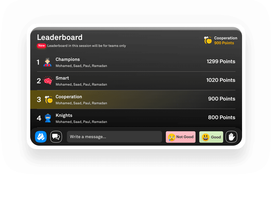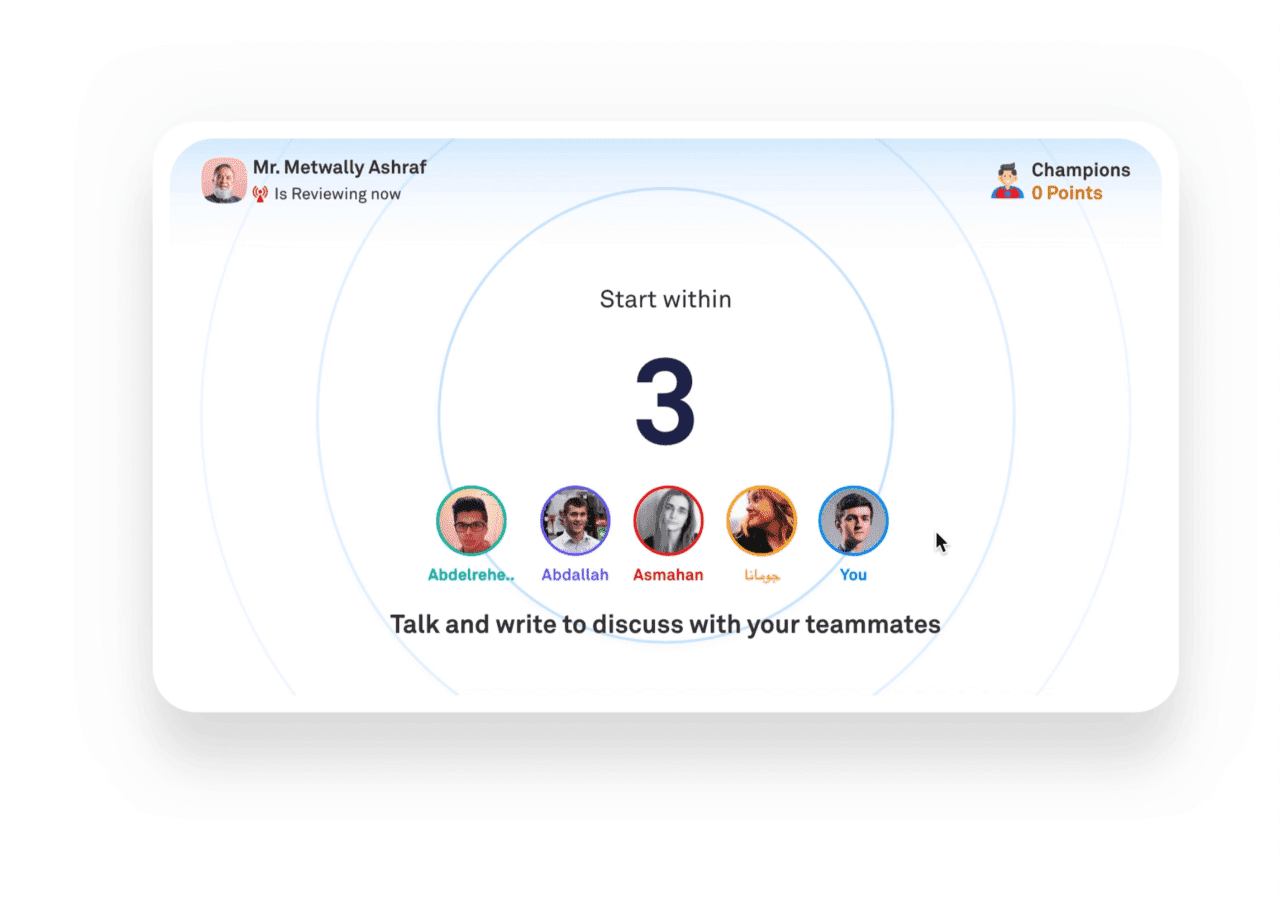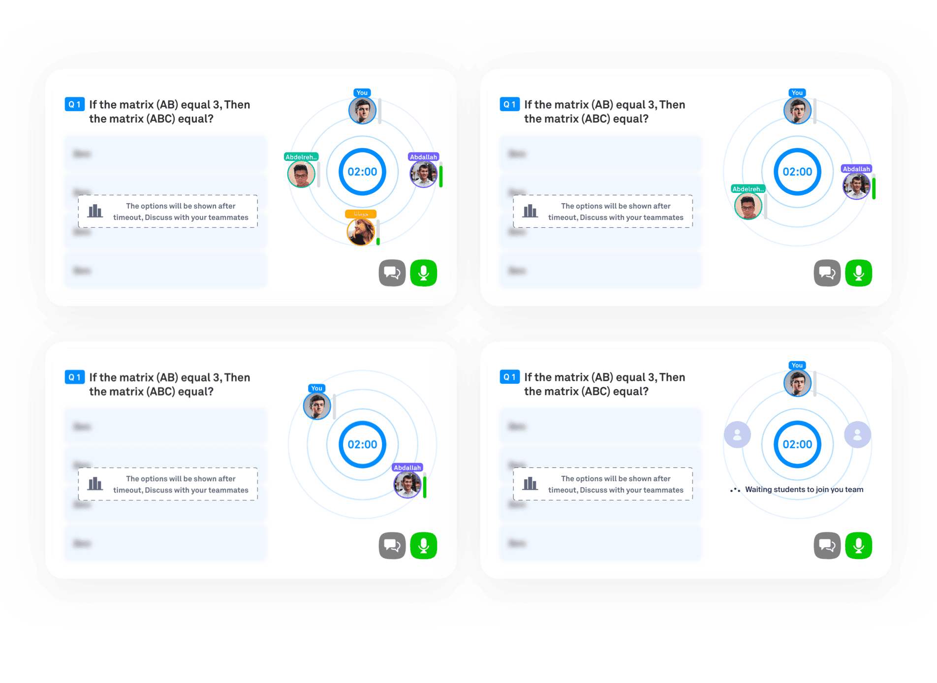 Students are grouped into small breakout teams, where they discuss questions via chat or voice before answering. Timed discussions, team identities, live feedback, and leaderboards create a collaborative and motivating experience.