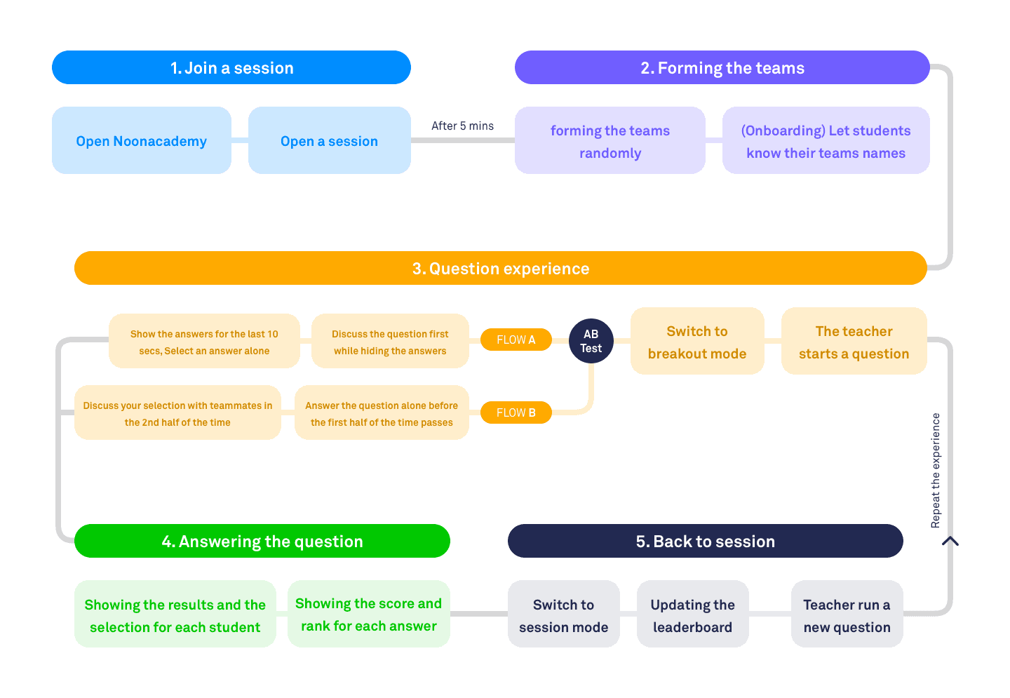Increasing participation, collaboration, and learning outcomes in remote education The Breakout Question Experience is a core interaction feature designed for Noon Academy, aimed at transforming passive online classes into collaborative, high-engagement learning sessions. The feature introduces peer-to-peer breakout groups during live classes, allowing students to discuss, answer, and reflect on questions together—bringing social learning theory into real-time digital education.