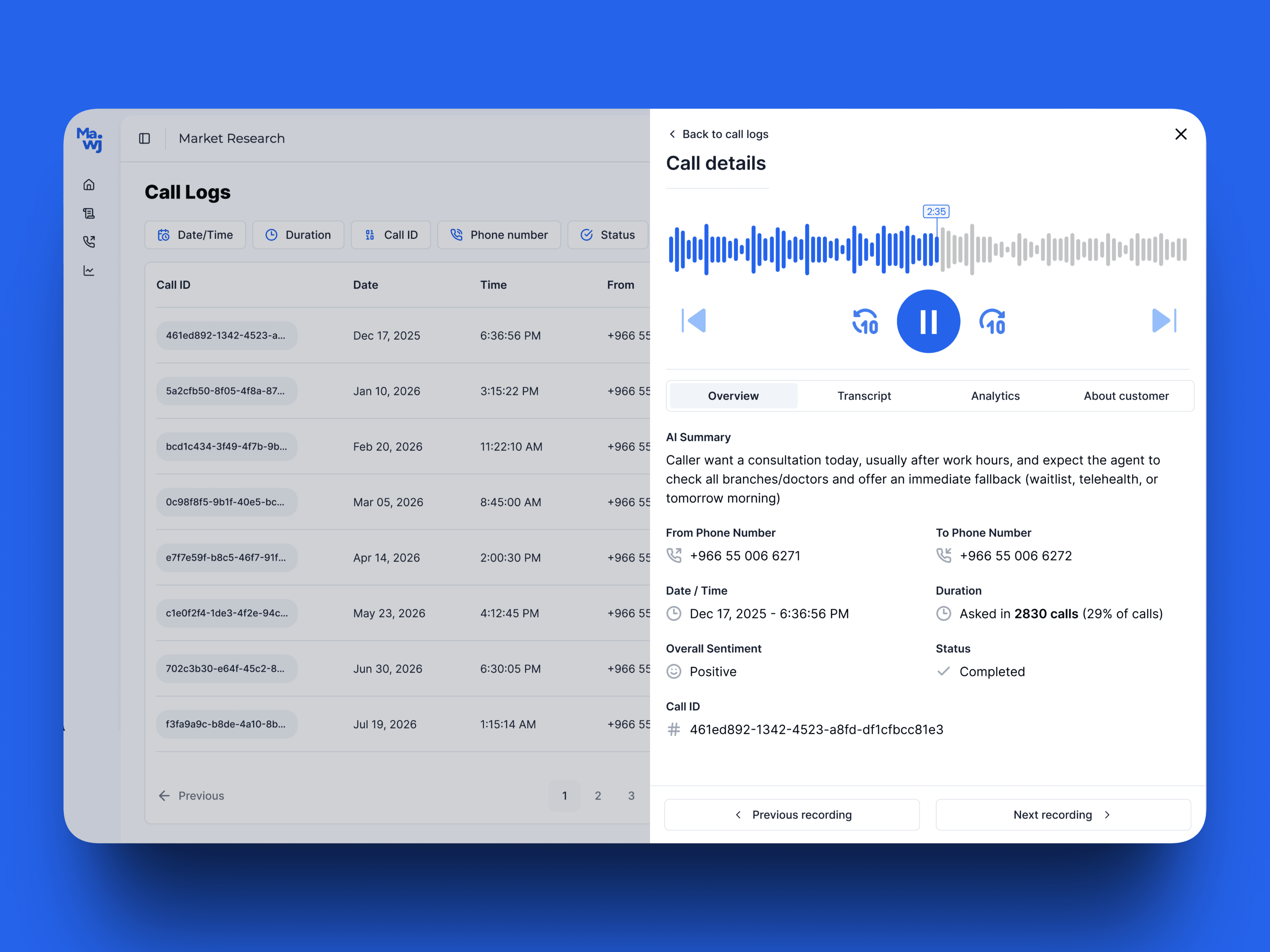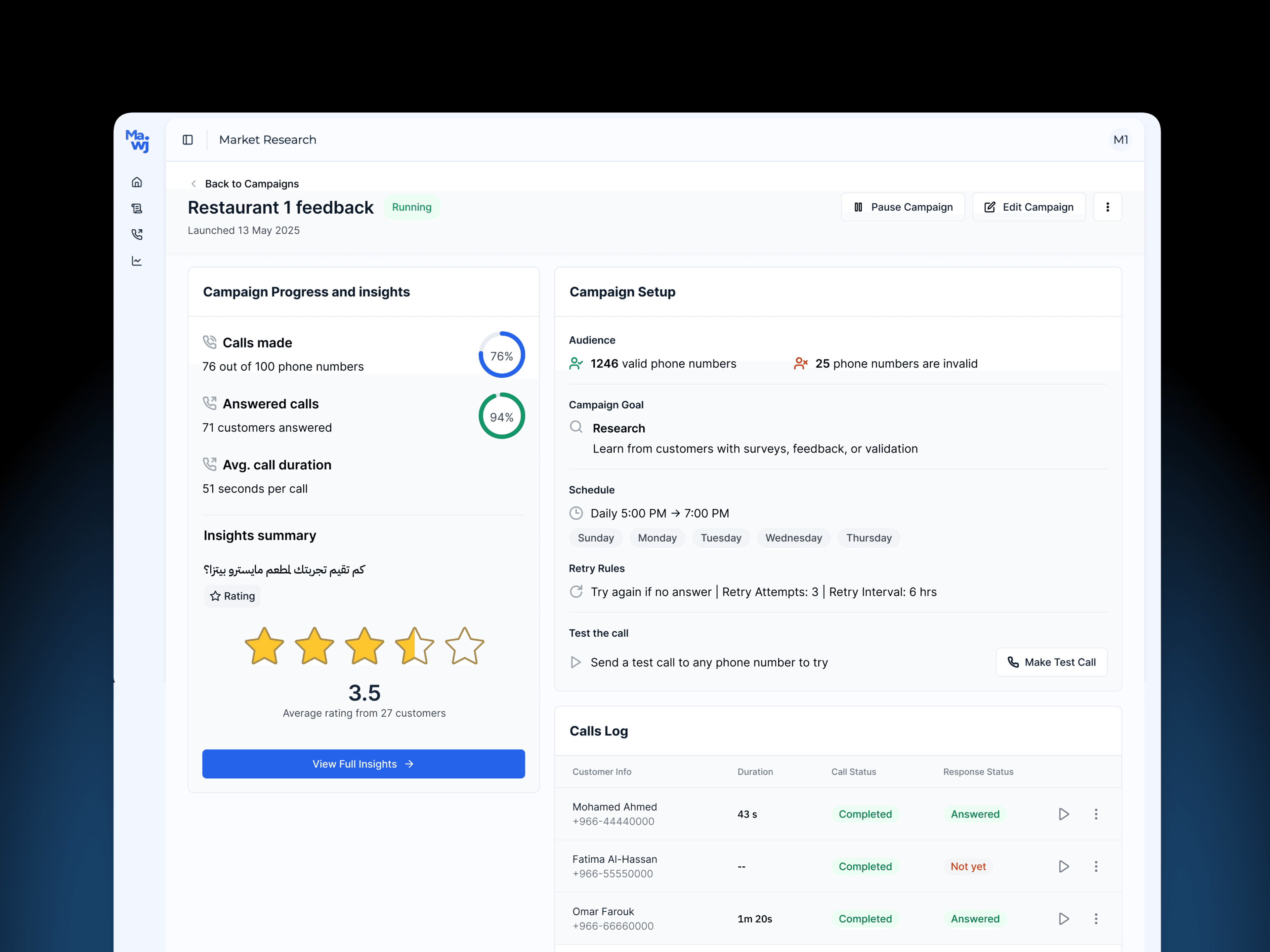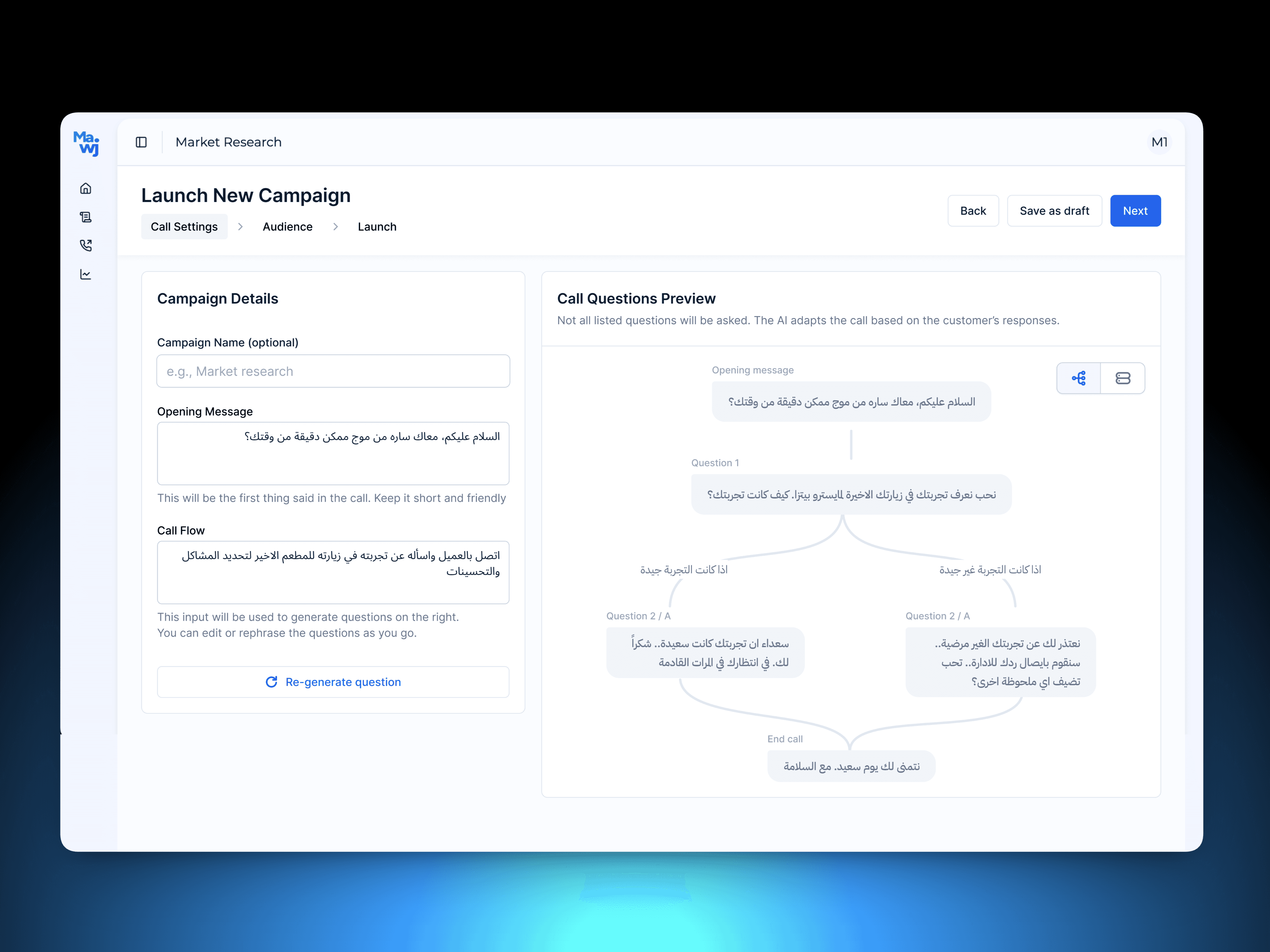 Helping businesses communicate, learn, and improve through AI-driven voice interactions Mawj is a B2B AI platform that enables organizations to deploy realistic AI phone agents for inbound and outbound calls at scale. The platform supports use cases such as market research, sales, reminders, verification, collections, and customer support—while providing deep analytics and automated insights from every conversation. A key competitive advantage is Mawj’s natural Saudi Arabic voice, enabling authentic, culturally aligned customer communication across the MENA region.