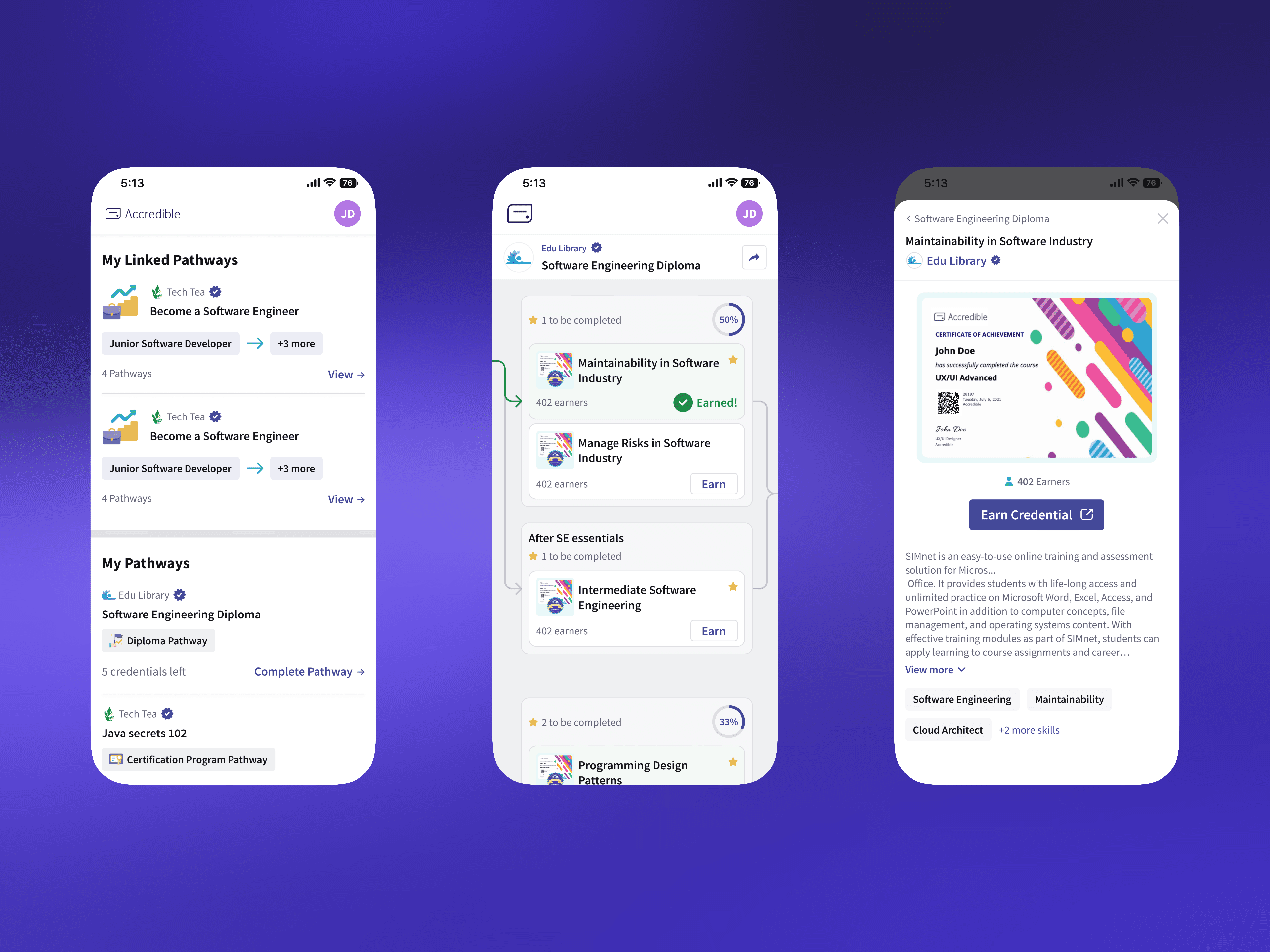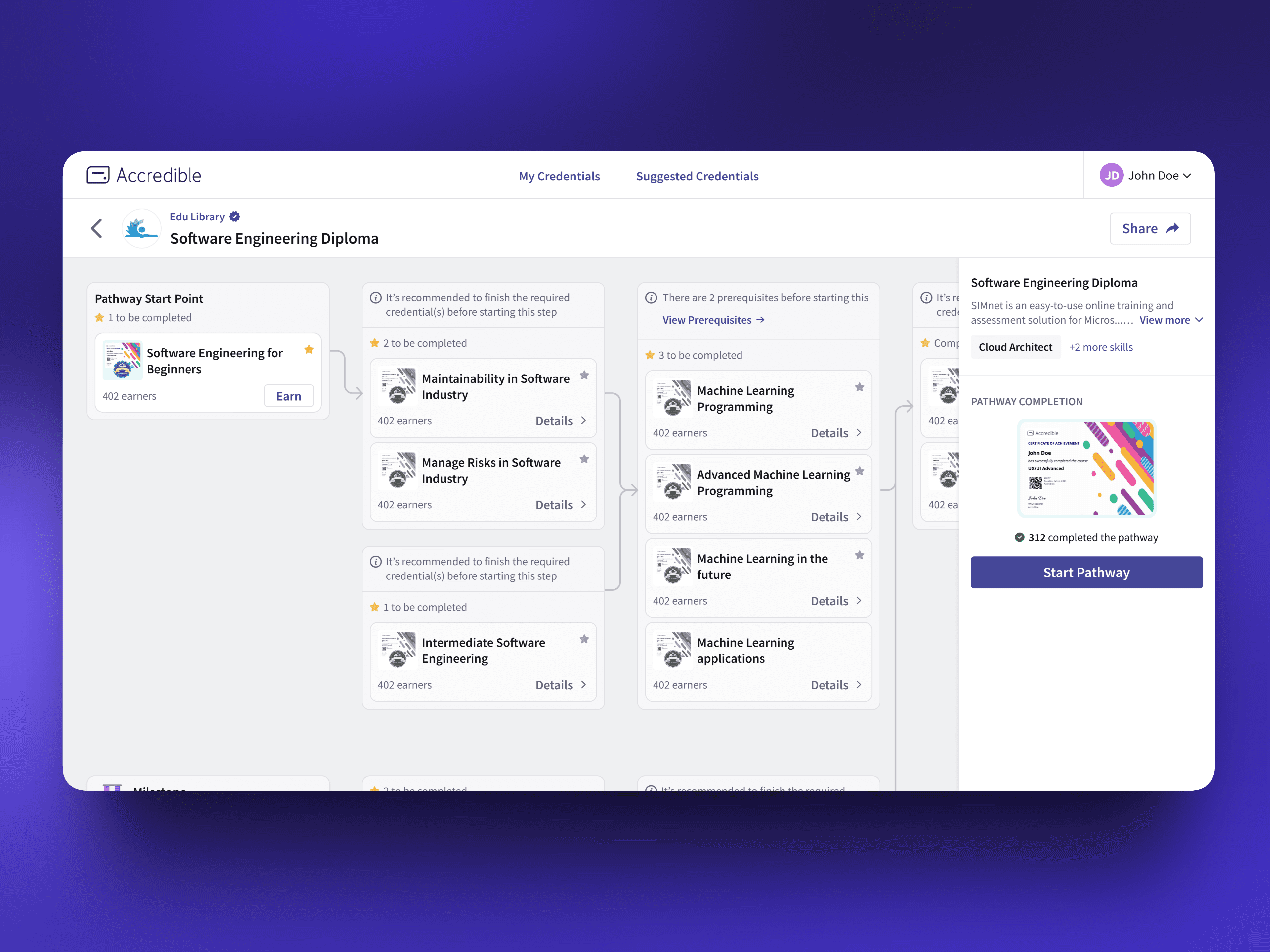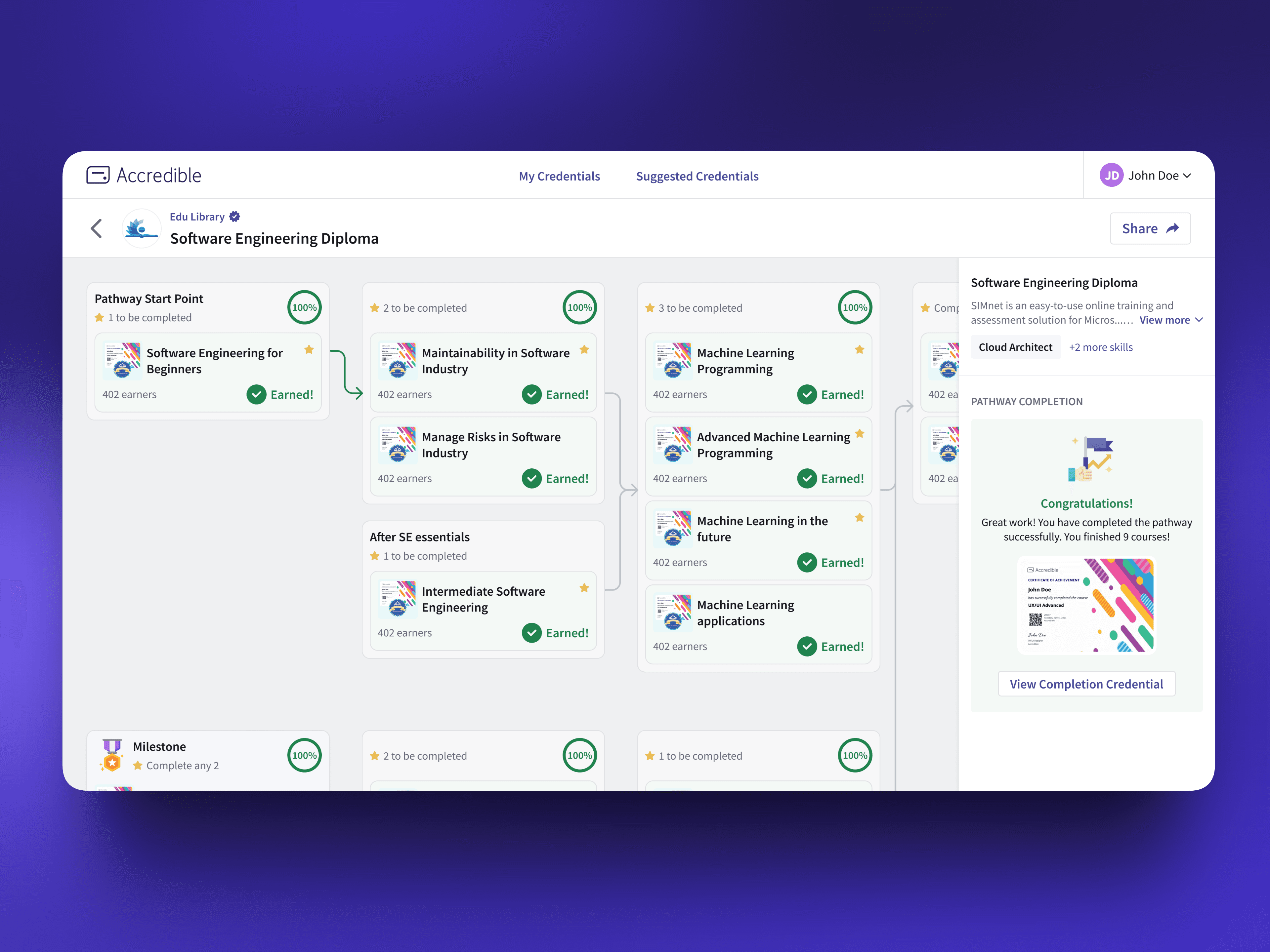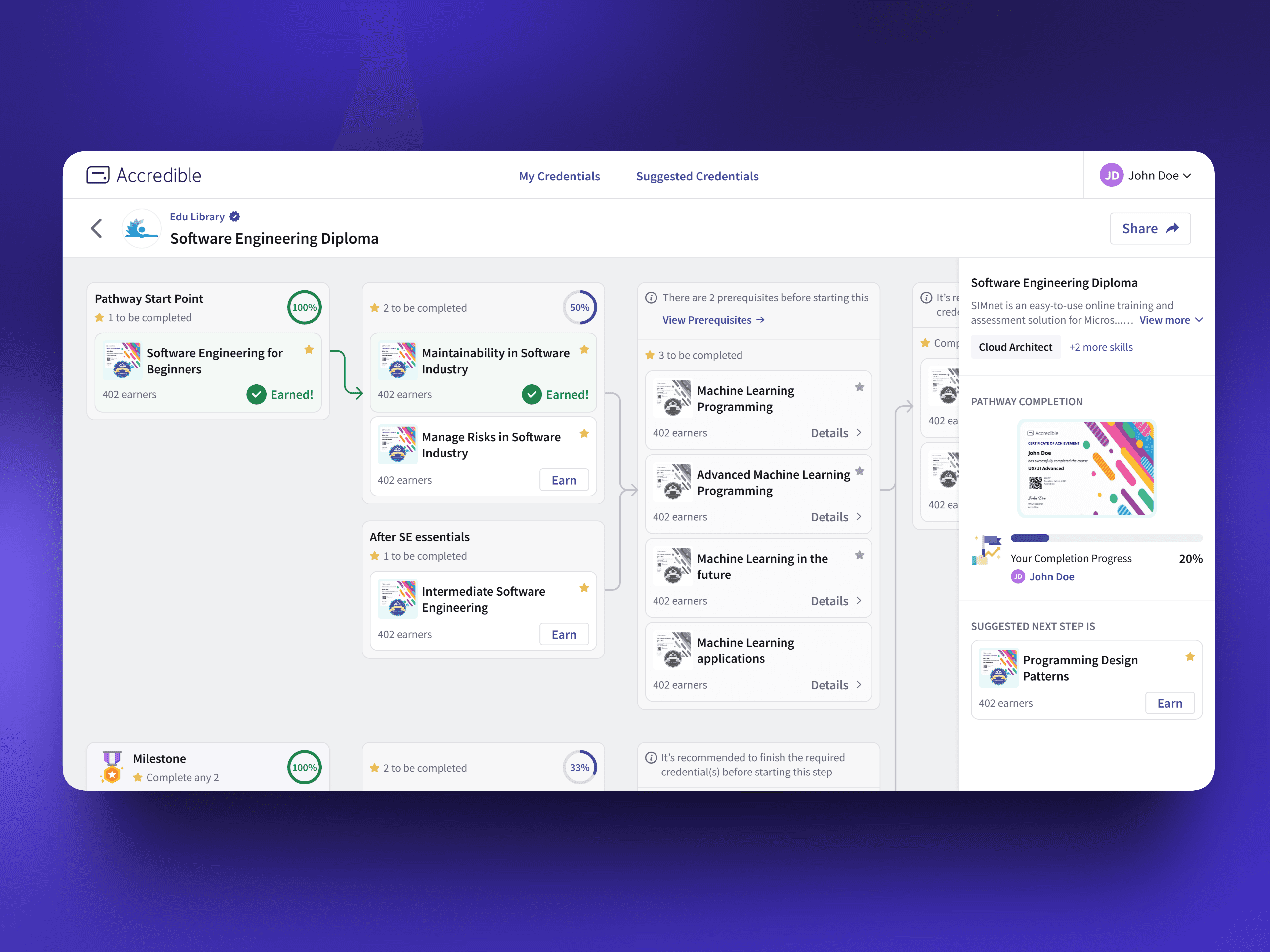 Transforming digital credentials into structured, verifiable learning and career journeys Pathways is Accredible’s program-design engine that enables organizations to connect credentials, requirements, and milestones into structured learning journeys—supporting outcomes such as diplomas, certification programs, and job titles. It marked a major shift in Accredible’s platform: from issuing standalone credentials to representing progress, intent, and readiness across learning and employment pathways.
