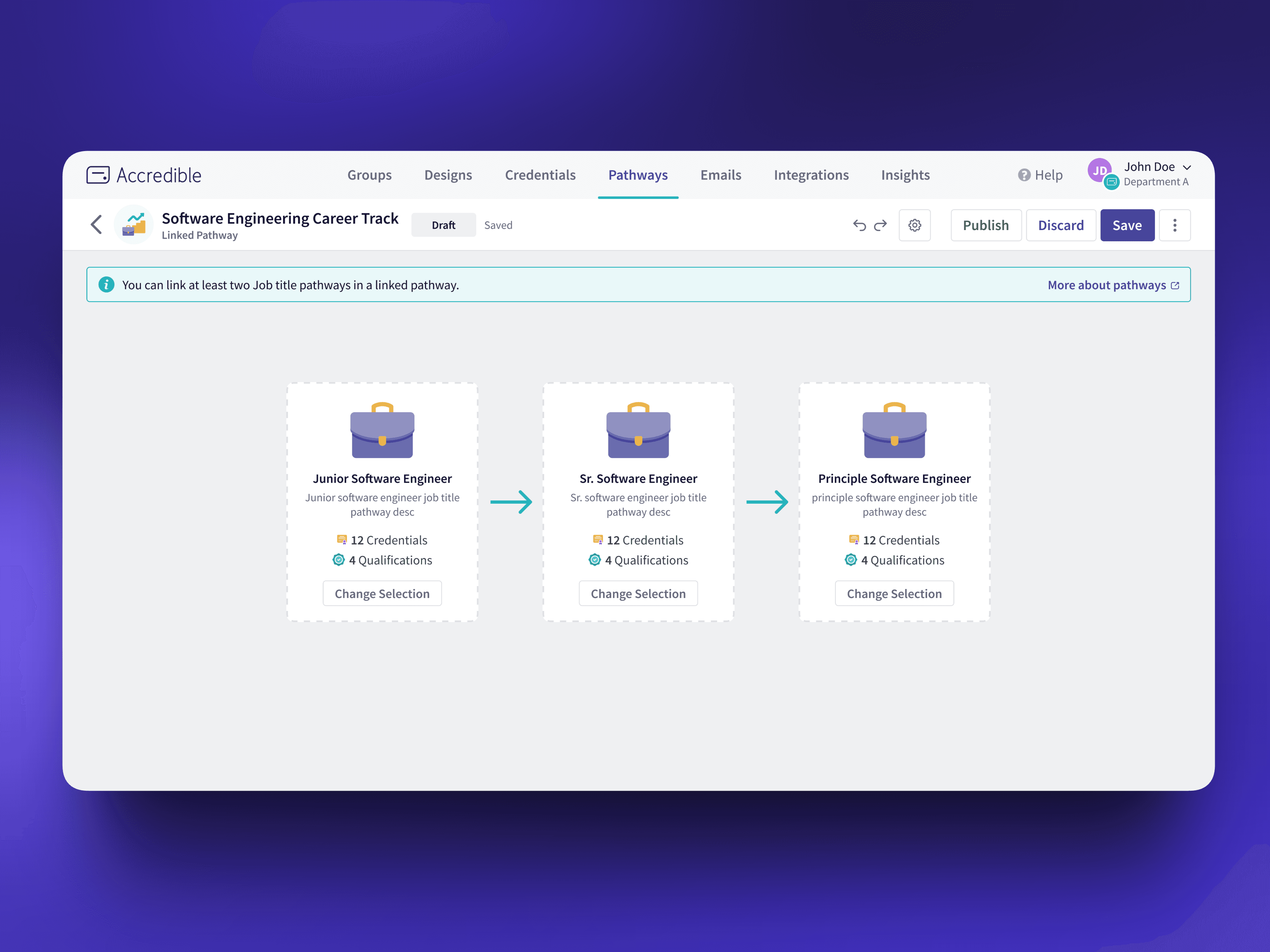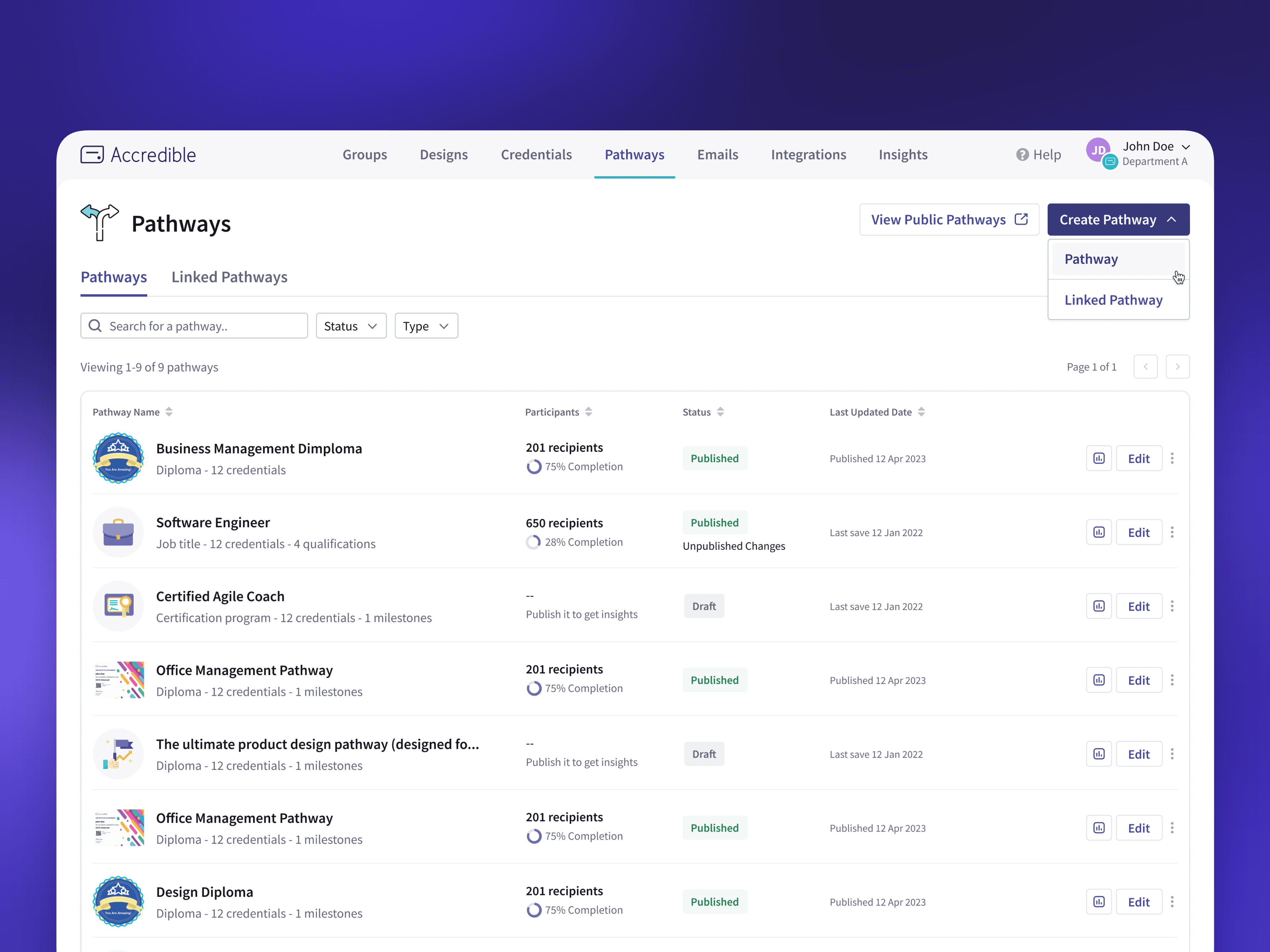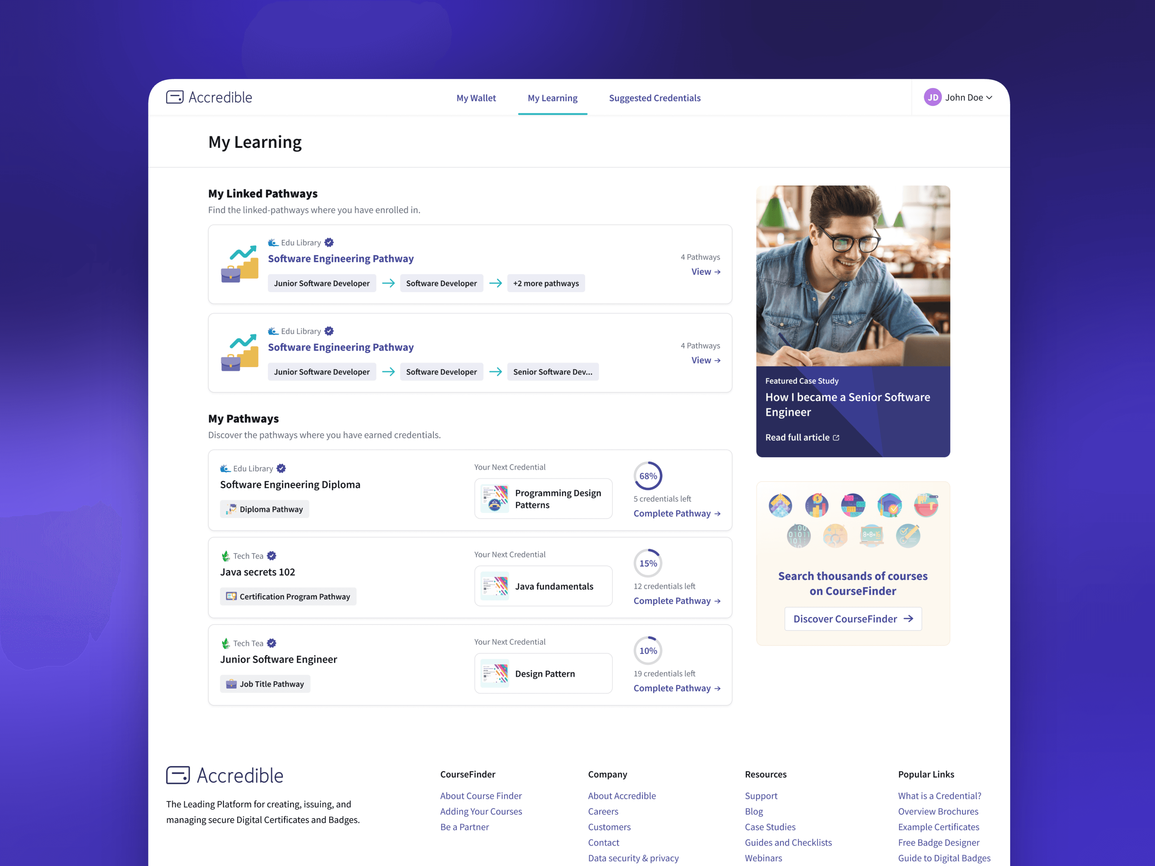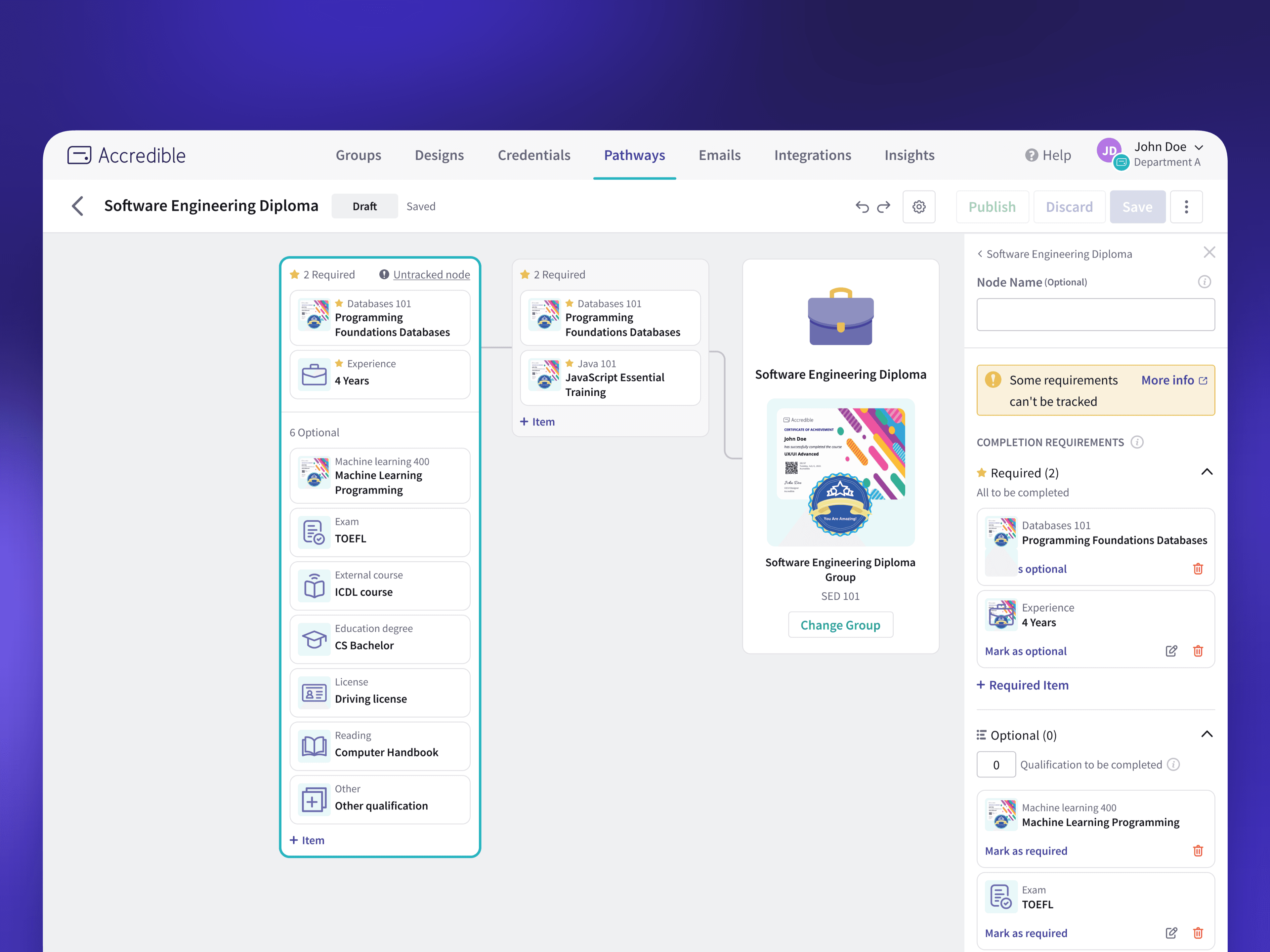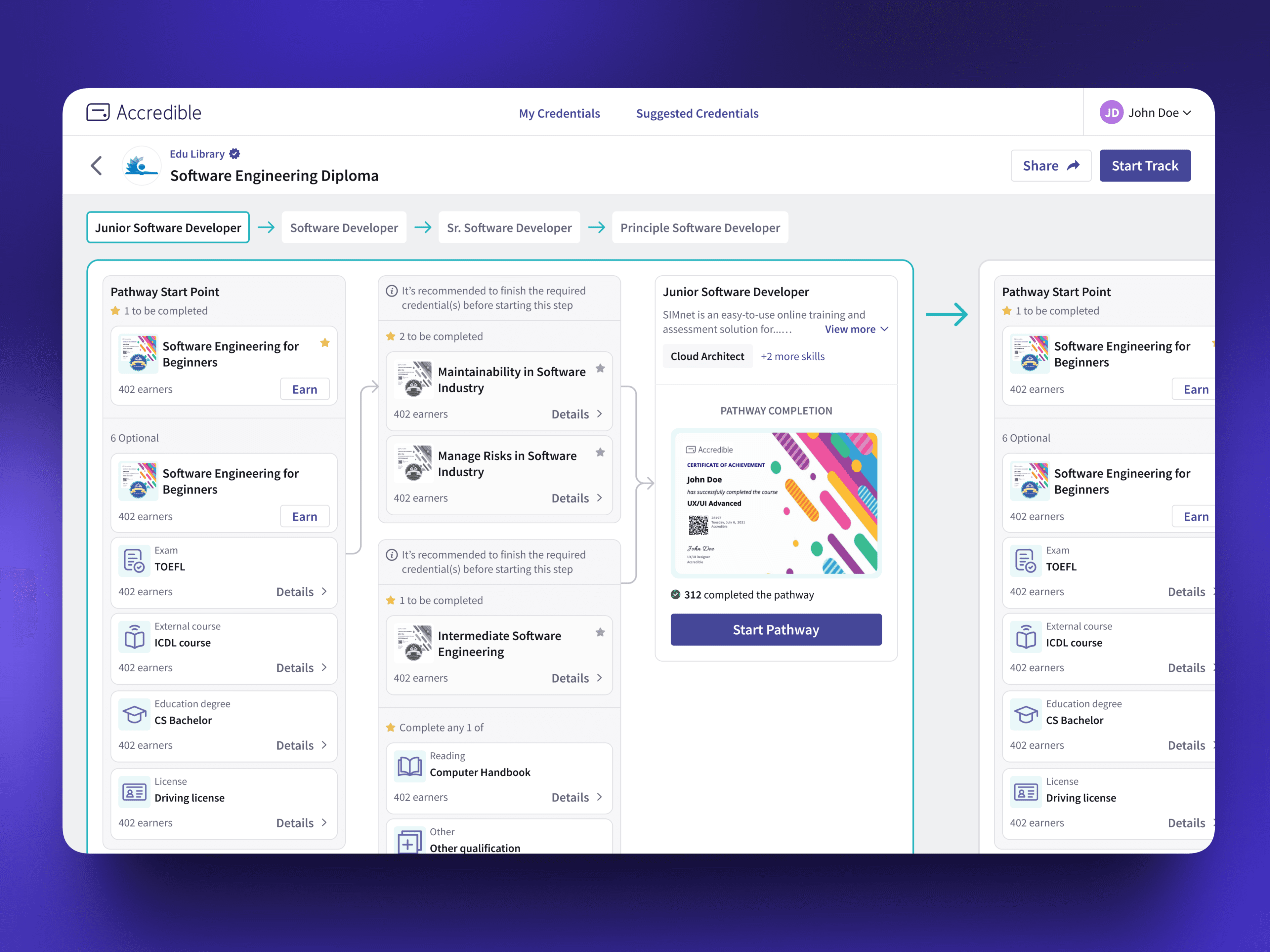 Transforming digital credentials into structured, verifiable learning and career journeys Pathways is Accredible’s program-design engine that enables organizations to connect credentials, requirements, and milestones into structured learning journeys—supporting outcomes such as diplomas, certification programs, and job titles. It marked a major shift in Accredible’s platform: from issuing standalone credentials to representing progress, intent, and readiness across learning and employment pathways.
