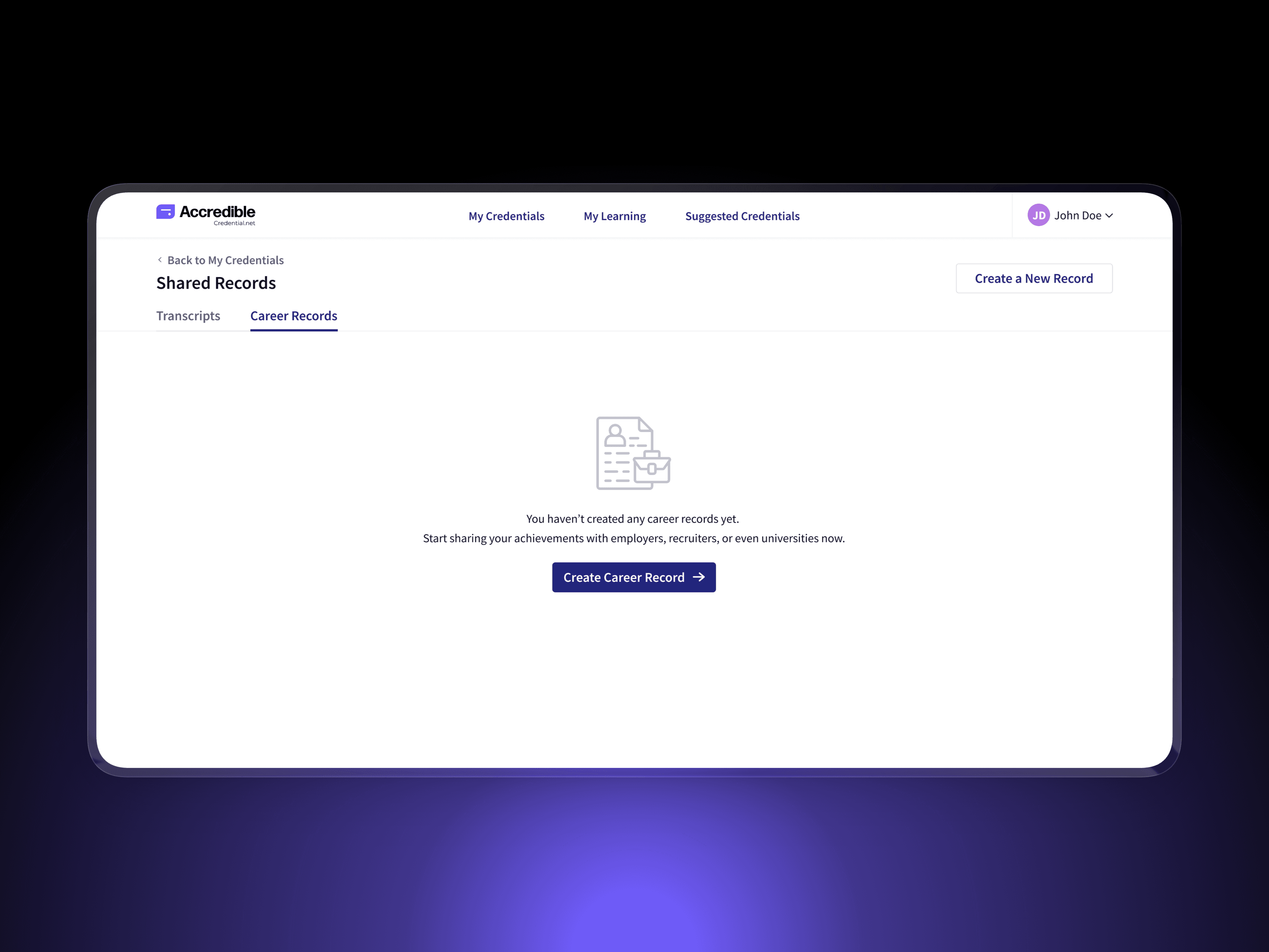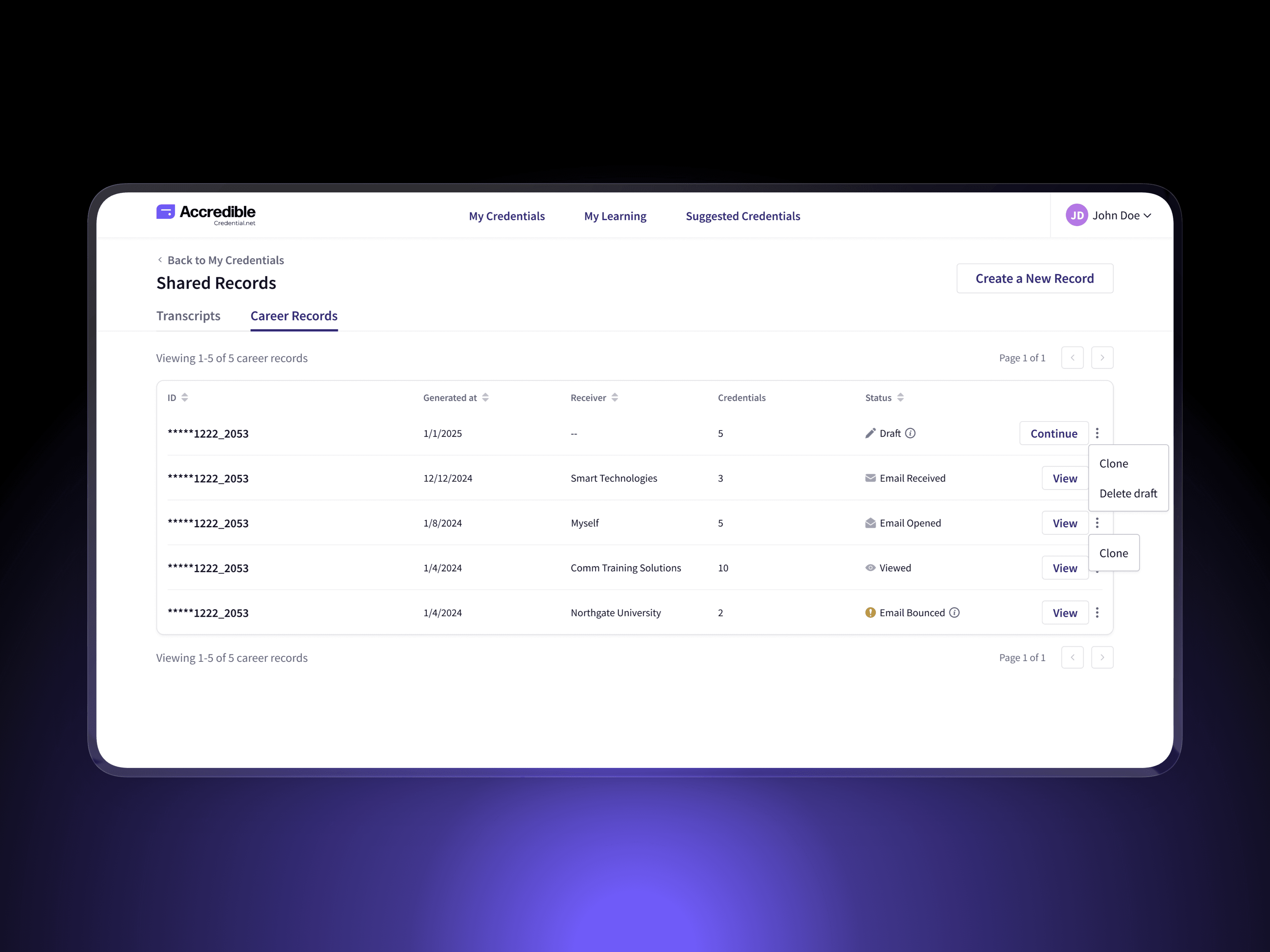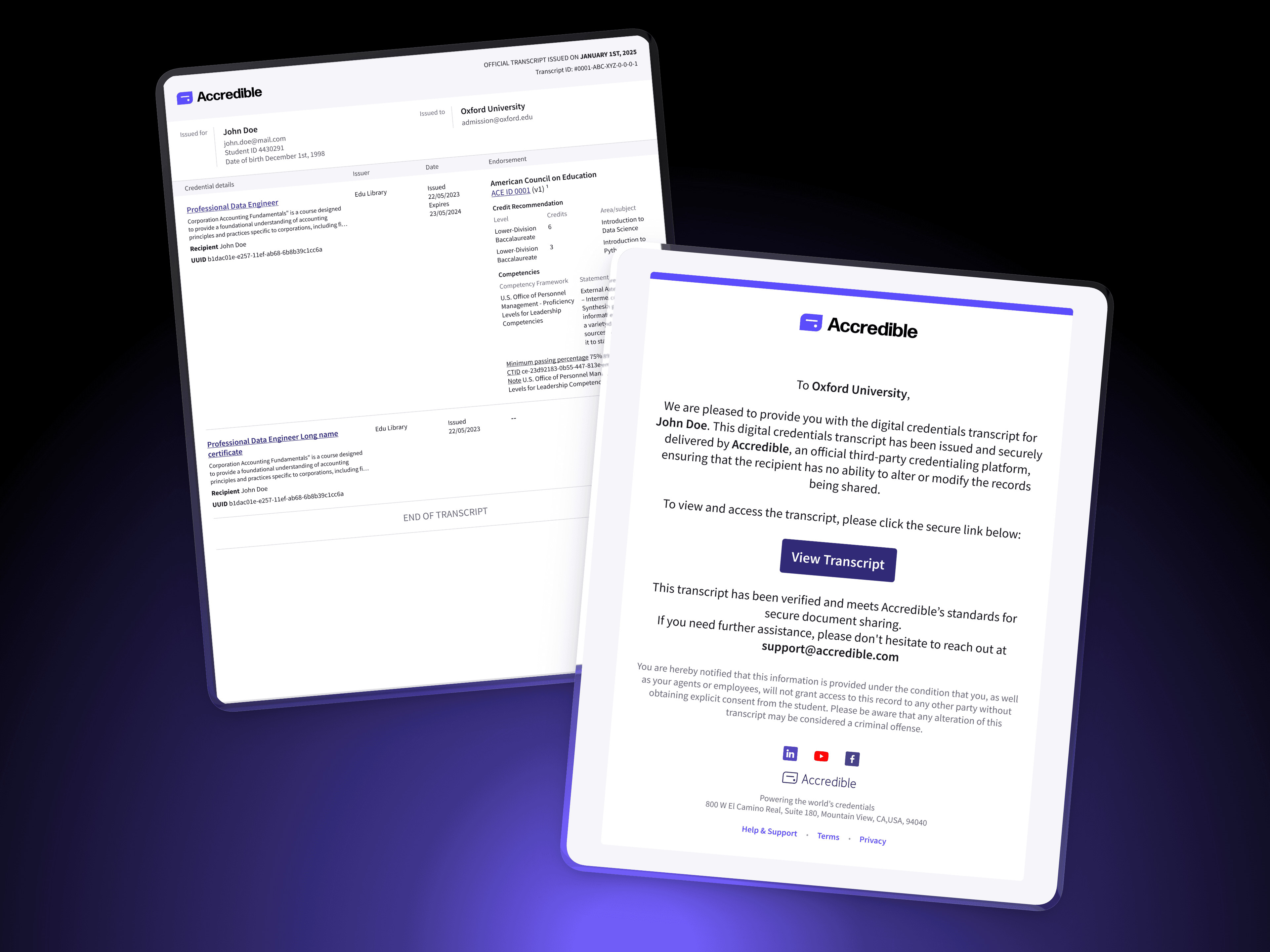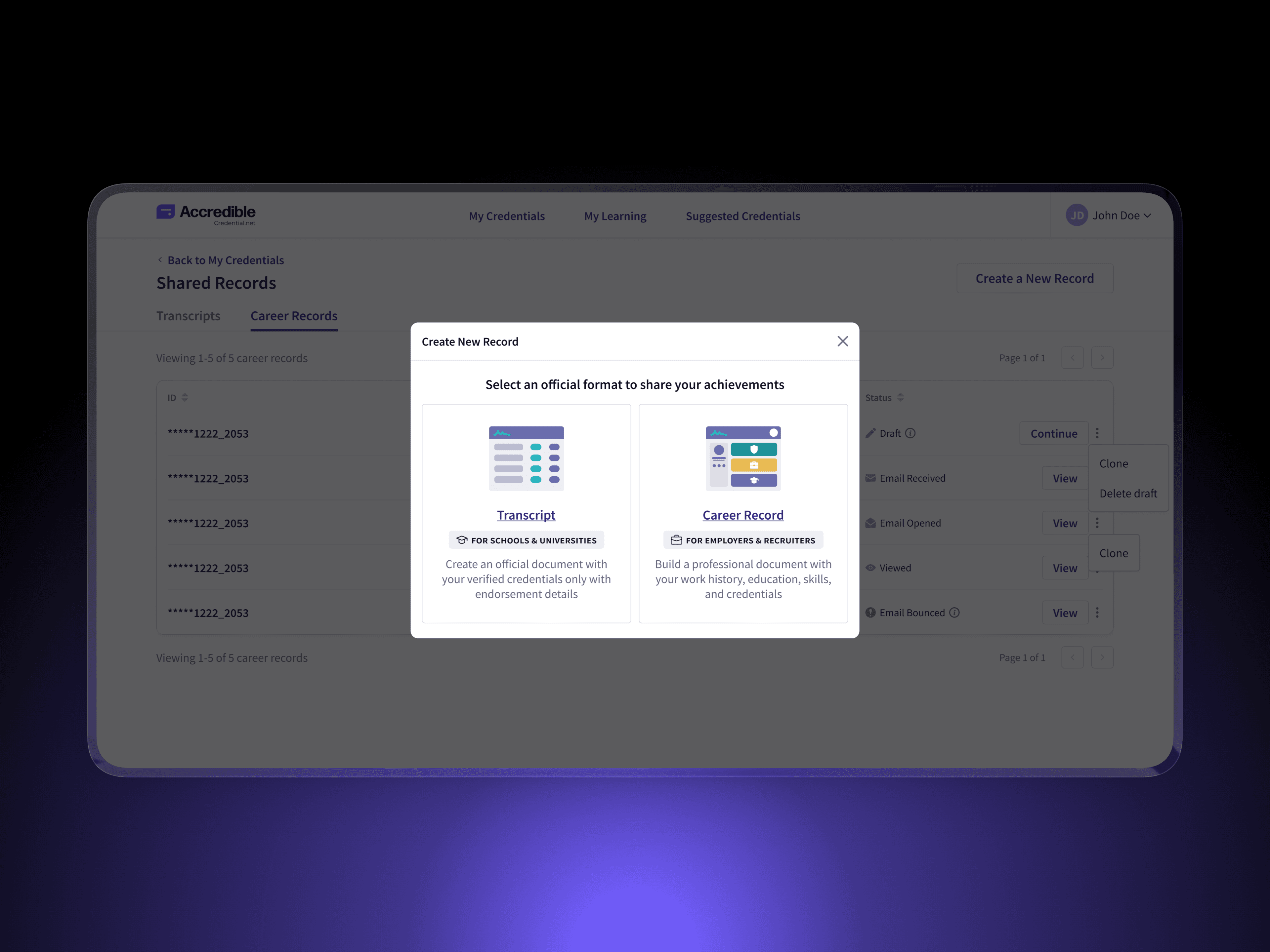 Establishing verified, institution-ready formats for sharing credentials at global scale This project introduced a new category of credential sharing within Accredible: Shared Records. It includes Digital Credential Transcripts for academic use and Verified Career Records for employment and professional review. Accredible operates at global scale, supporting 160M+ issued credentials, 30M+ learners, and 2,300+ organizations, where trust, verification, and clarity are critical. My Role | Senior Product Designer — end-to-end ownership