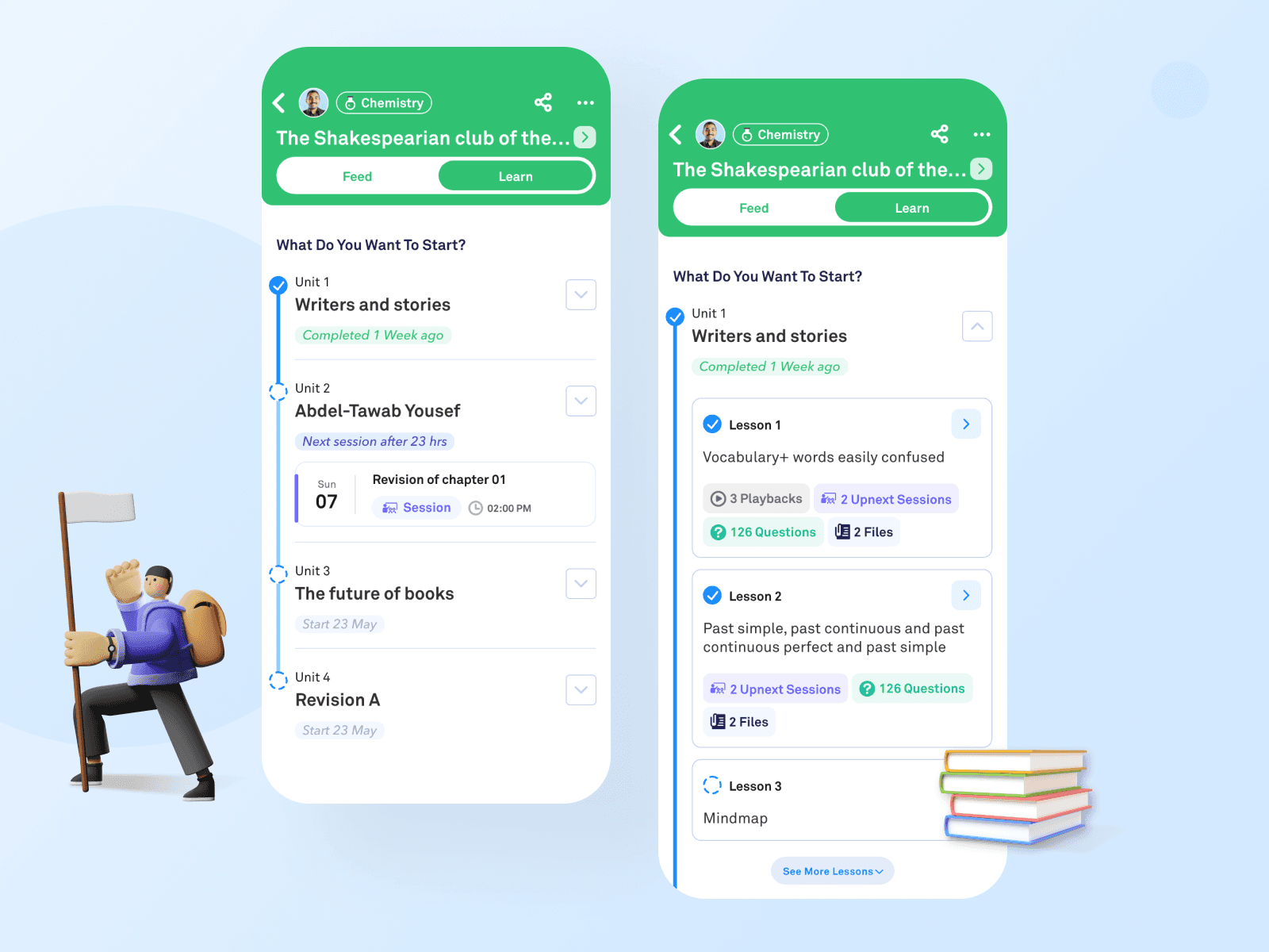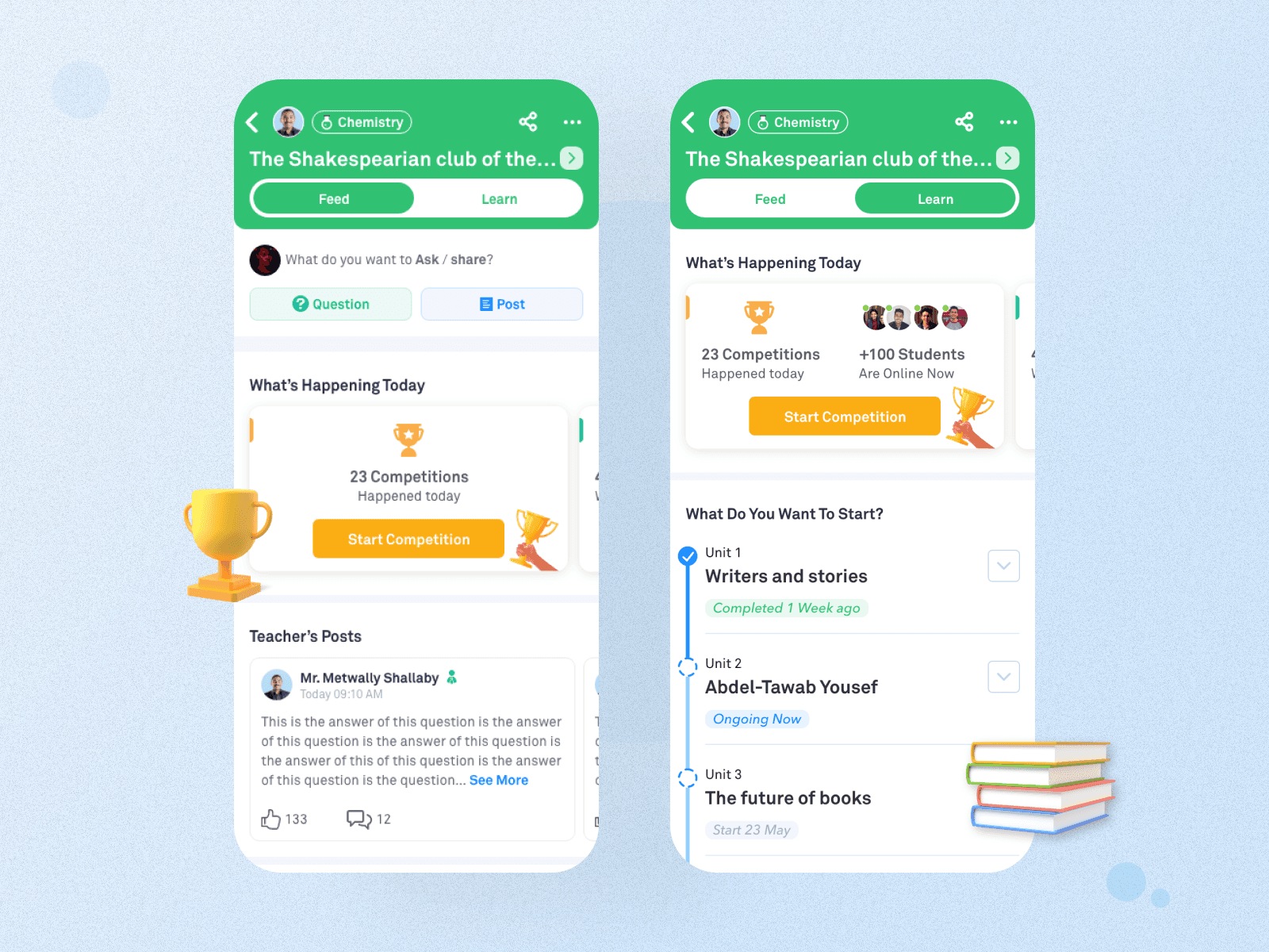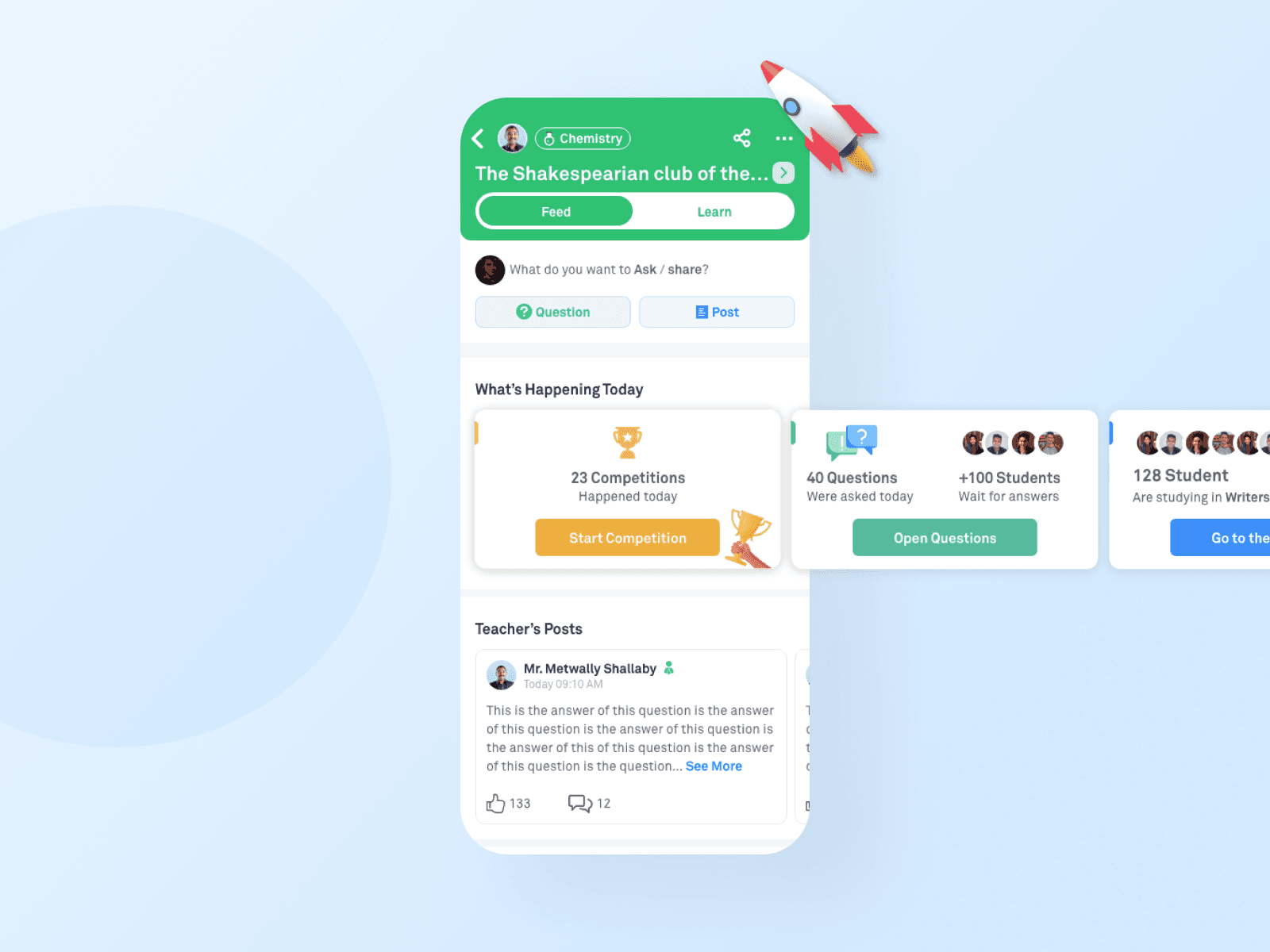 Groups were restructured around Feed (interaction) and Learn (content), allowing students to move seamlessly between social activity and curriculum progression.